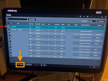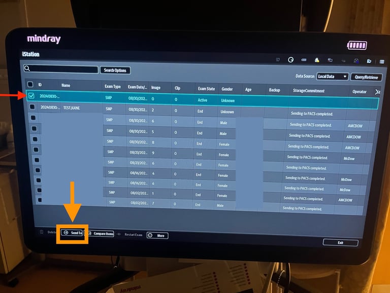 3) If the "Sending to PACS completed" is missing next to your study, select the study by tapping on it. This will activate the "Send To" button at the bottom left of the screen. Push "Send To" and this will take you to the screen to confirm re-submission.