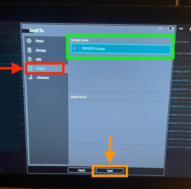 4) After selecting "Send To" from the iStation list, you will be taken to the following screen. Click on "DICOM" (red arrow) and then click on "Synchronicity" (green box) as the targeted storage server. Confirm this by clicking "Send" (orange arrow) to archive the study.