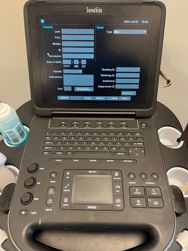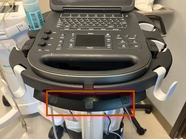 After entering patient information and pressing Done you will return to the scanning screen. From here you can begin your exam or change your transducer (if your machine is equipped with more than one probe). Depending on your machine's configuration, you may havre to manually exchange the probe on the device. Alternatively, some machines will be on a stand that allows you to choose the probe by pushing one of the black buttons on the device (red box)