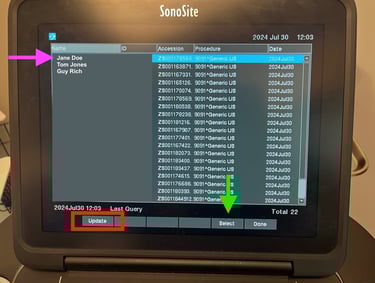 To properly begin a study, you will need to enter patient information. Do so by selecting the Patient button (red arrow, left) to get to the patient information screen. Here you can enter the patient's MRN (red box, middle). If your device is equipped with a barcode scanner, please put the cursor into the MRN box and then scan that patient's barcode to pull in the patient information. If you do not have a barcode scanner, you can type in the relevant patient information, use the query feature, or use the worklist feature to pull in information. To manually query the worklist, type in the MRN, and then press the Query button (green box, middle) to pull in the rest of the patient information. To select the patient from the worklist screen, press the Worklist button (magenta box, middle). On this screen push the Update button (red box, right), click on the appropriate patient from the list (magenta arrow, right), and then push Select (green arrow, right). Finally, add your user ID in the Reading Dr. field (yellow box, middle). Once you have entered the requisite information, click Done (blue box, middle) to proceed to your study.