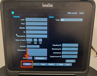 To end your study and start the upload process, return to the Patient information screen by pressing Patient. Select New/End (red box, right) at the bottom of the screen to finalize the study and submit for upload. After ending a study, please return the machine to its home. Leave the machine powered on and plugged in - this will give it time to upload and archive studies to Synchronicity. Most machines have an auto-off feature and will turn themselves off after studies have uploaded