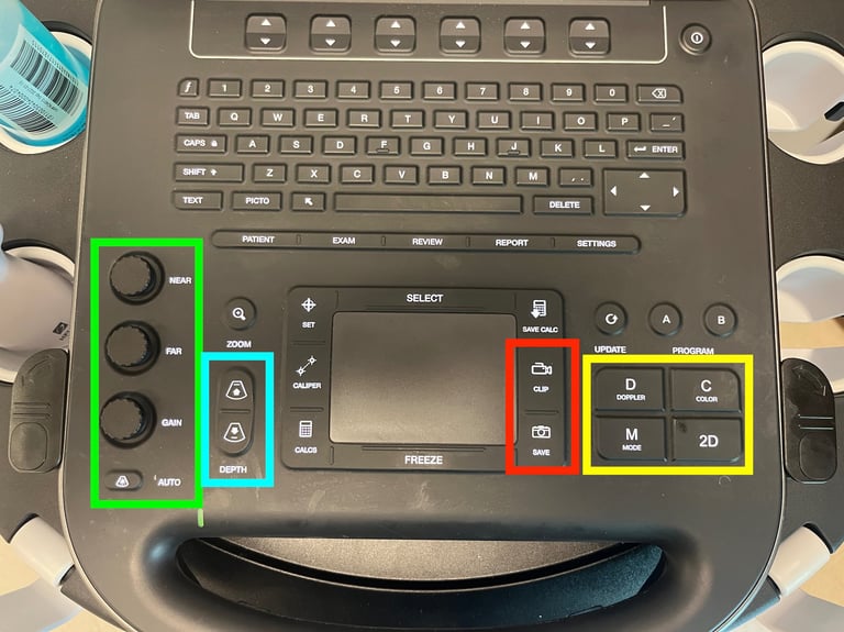 After choosing your probe you can complete your study. Please note the controls for saving stills and clips as represented by the Camera and Film buttons (red box). Doppler (C) and M mode are located to the right of the machine (yellow box). Gain is controlled by the knobs on the left side of the machine (green box) while depth is controlled by the buttons (cyan box).