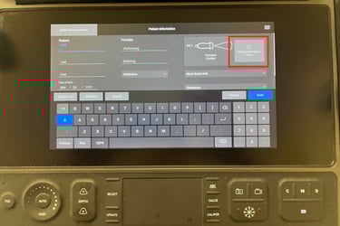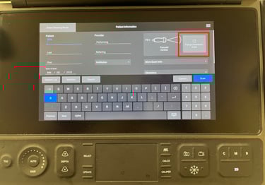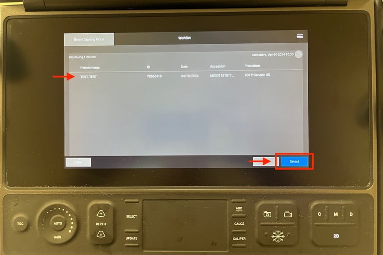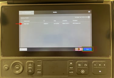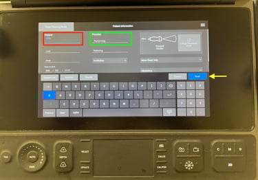 To properly begin a study, you will need to enter patient information. Do so by selecting the green Enter patient information button to get to the patient information screen. Here you can enter the patient's MRN (red box) as well as your user ID in the performing field (green box). If your device is equipped with a barcode scanner, scan that patient's barcode to pull in the patient information. This will load the auto-query screen where you can tap on your patient from the worklist and then push Select. Once you have entered the requisite information, click Scan (yellow arrow) to proceed to your study.