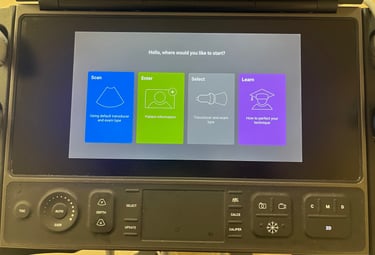 When the machine powers up, you should see this default home screen. From here you can select probes, choose to enter patient information, launch the on machine educational modules, or even immediately begin scanning.