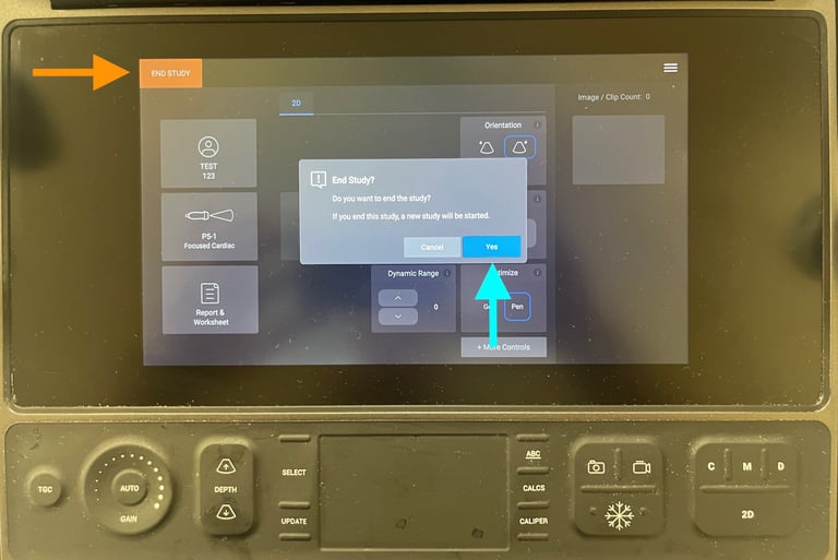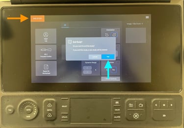 When you have completed your study, make sure to click End Study in the top left corner (orange arrow). This will prompt you to confirm that you would like to end the study. Please do so by tapping Yes in the pop-up box (blue arrow). Some machines will have updated software and will present an alternate end study screen. If presented with this new version (right), ensure that "SYNCH" is selected prior to hitting End Study. This will officially close your study and instruct the machine to upload it to synchronicity. After ending a study, please return the machine to its home. Leave the machine powered on and plugged in - this will give it time to upload and archive studies to Synchronicity. Most machines have an auto-off feature and will turn themselves off after studies have uploaded.