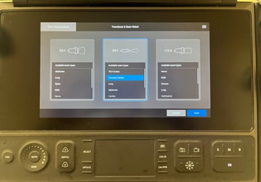 You may need to change your probe or exam type before scanning. This can be done by tapping on the Change transducer/exam button (red box) on the patient information screen. Alternatively, you can change probes by tapping the transducer button (green box) on the scanning screen. These will load the Probe/Exam selection screen. Please choose accordingly and tap Scan to continue to your study.