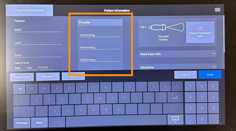 Adding additional operators to the study depends on the machine's software version. On older versions you will see the Performing filed as was highlighted in green above. On these machines add multiple users using the "\" separator i.e operator1\operator2. On updated machines, this area will have seperate lines for each operator as pictured below (orange). Enter each operator on a new line.