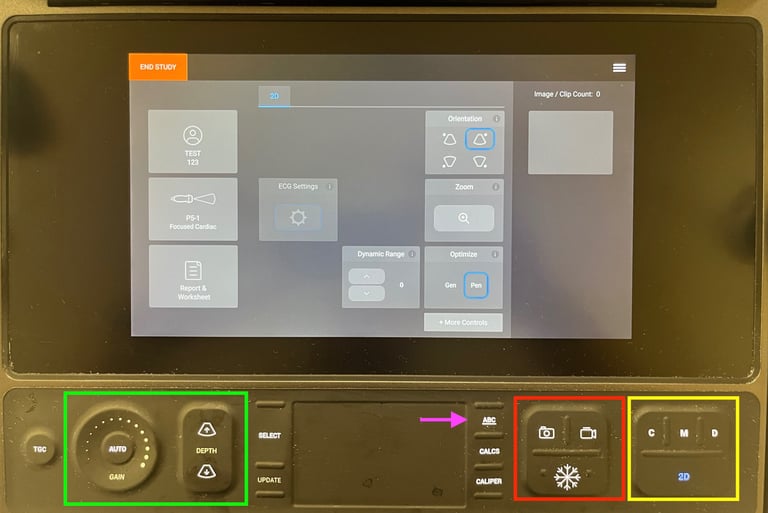 Once the patient information has been entered and the appropriate probe and exam type selected, you can proceed to image your patient. Please note the controls for freezing, saving stills, and saving clips at the bottom (red). Doppler options and M mode are located on the right of the control panel (yellow). Depth and gain are controlled by the buttons on the left side of the control panel (green). Annotations can be made with the ABC button (magenta arrow). The touch screen will also have additional options and setting you can configure depending on the exam type and context.