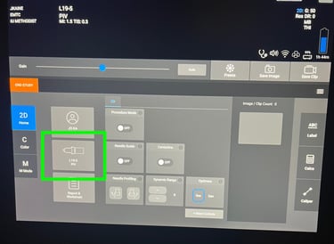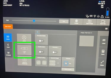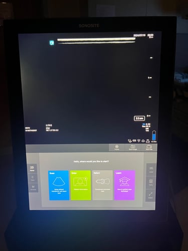 When the machine powers up, you should see this default home screen. From here you can select probes, choose to enter patient information, launch the on machine educational modules, or even immediately begin scanning.