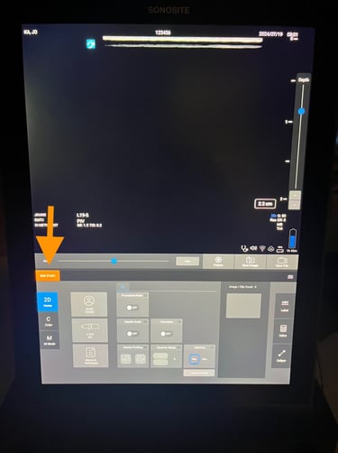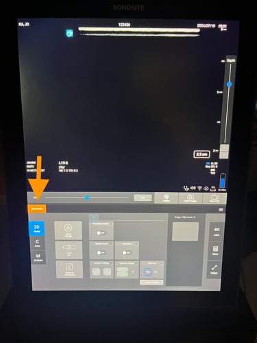 Once the patient information has been entered and the appropriate probe and exam type selected, you can proceed to image your patient. Please note the controls for freezing, saving stills, and saving clips in the middle of the screen (red). Doppler options and M mode are located on the left of the control panel (yellow). Depth is controlled by the slider on the right side of the screen (green) while gain is controlled by the slider beneath the image (blue). Annotations can be made with the ABC button (magenta arrow). The touch screen will also have additional options and setting you can configure depending on the exam type and context.