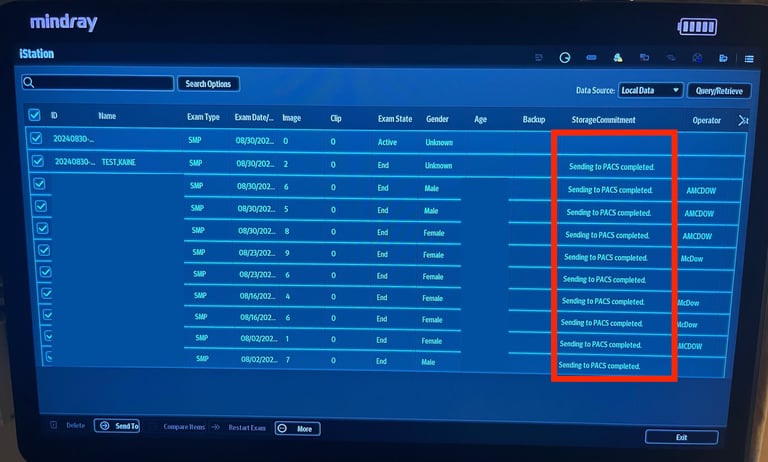 2) If your study has been appropriately ended, next check to see if it has been "archived" (sent to Synchronicity). You can do this by clicking on the "iStation" button to access the past study list. If your study has been successfully archived, you should see "Sending to PACS completed." listed under the "Storage Commitment" column. Please note that you may have to scroll sideways in the list to see this column. If you do not see the "Sending to PACS completed" message, see below. If you do see this message and you cannot find your study in Synchronicity, see the Synchronicity guide or contact your local IT team.