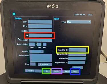 To properly begin a study, you will need to enter patient information. Do so by selecting the Patient button (red arrow, left) to get to the patient information screen. Here you can enter the patient's MRN (red box, middle). If your device is equipped with a barcode scanner, please put the cursor into the MRN box and then scan that patient's barcode to pull in the patient information. If you do not have a barcode scanner, you can type in the relevant patient information, use the query feature, or use the worklist feature to pull in information. To manually query the worklist, type in the MRN, and then press the Query button (green box, middle) to pull in the rest of the patient information. To select the patient from the worklist screen, press the Worklist button (magenta box, middle). On this screen push the Update button (red box, right), click on the appropriate patient from the list (magenta arrow, right), and then push Select (green arrow, right). Finally, add your user ID in the Reading Dr. field (yellow box, middle). Once you have entered the requisite information, click Done (blue box, middle) to proceed to your study.