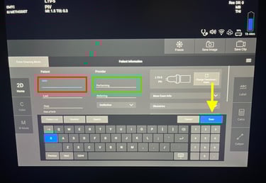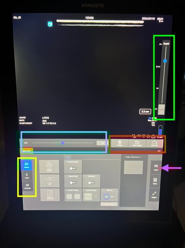 Once the patient information has been entered and the appropriate probe and exam type selected, you can proceed to image your patient. Please note the controls for freezing, saving stills, and saving clips in the middle of the screen (red). Doppler options and M mode are located on the left of the control panel (yellow). Depth is controlled by the slider on the right side of the screen (green) while gain is controlled by the slider beneath the image (blue). Annotations can be made with the ABC button (magenta arrow). The touch screen will also have additional options and setting you can configure depending on the exam type and context.
