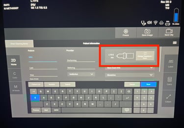 You may need to change your probe or exam type before scanning. This can be done by tapping on the Change transducer/exam button (red box) on the patient information screen. Alternatively, you can change probes by tapping the transducer button (green box) on the scanning screen. These will load the Probe/Exam selection screen. Please choose accordingly and tap Scan to continue to your study.