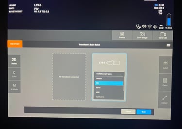 When the machine powers up, you should see this default home screen. From here you can select probes, choose to enter patient information, launch the on machine educational modules, or even immediately begin scanning.